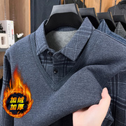 2024冬季假两件保暖衬衫加绒加厚棉质商务休闲男装套头针织衫衬衣