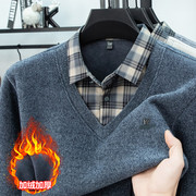 秋冬季男士羊毛假两件加绒加厚衬衫V领套头保暖毛衣针织衫羊毛衫