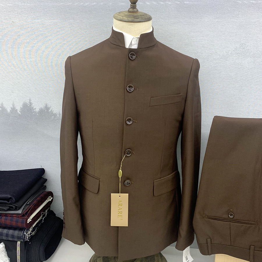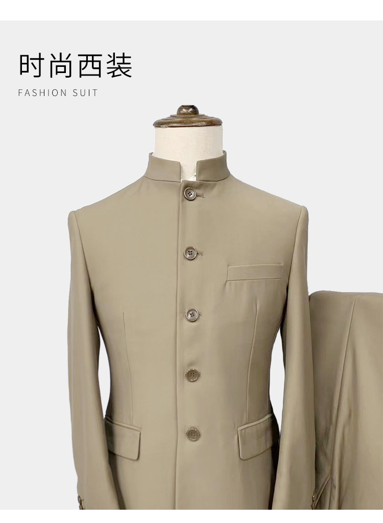 中山领西服男商务结婚新郎立领修身唐装纯色西装二件套男工厂现货