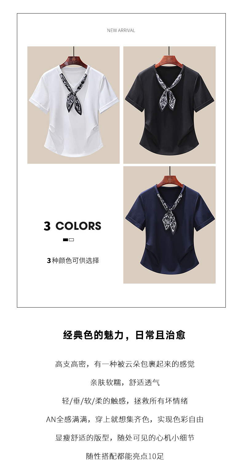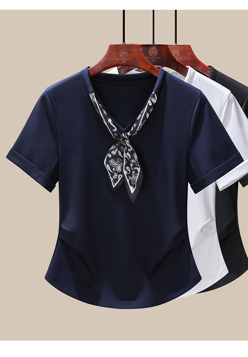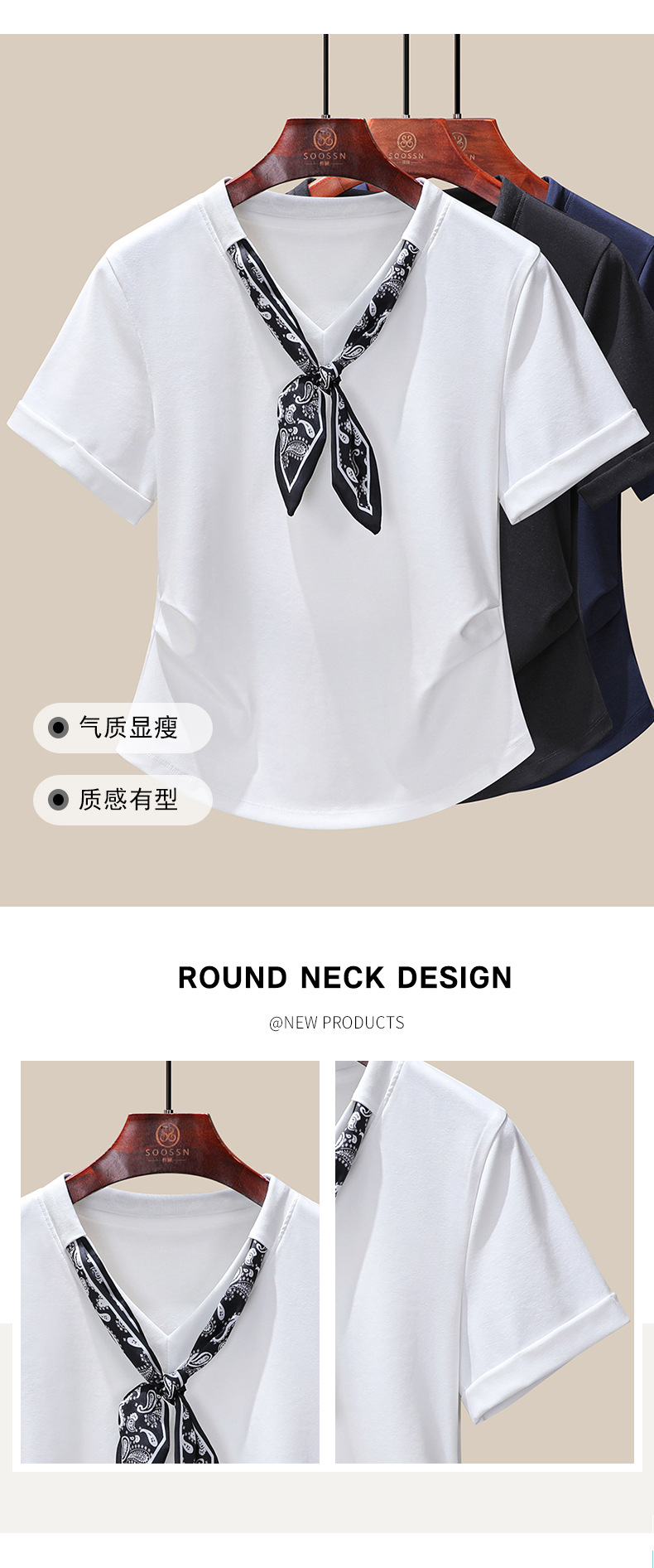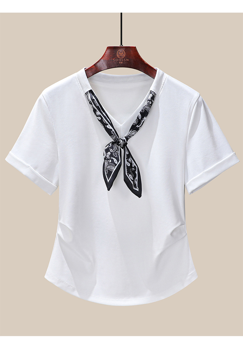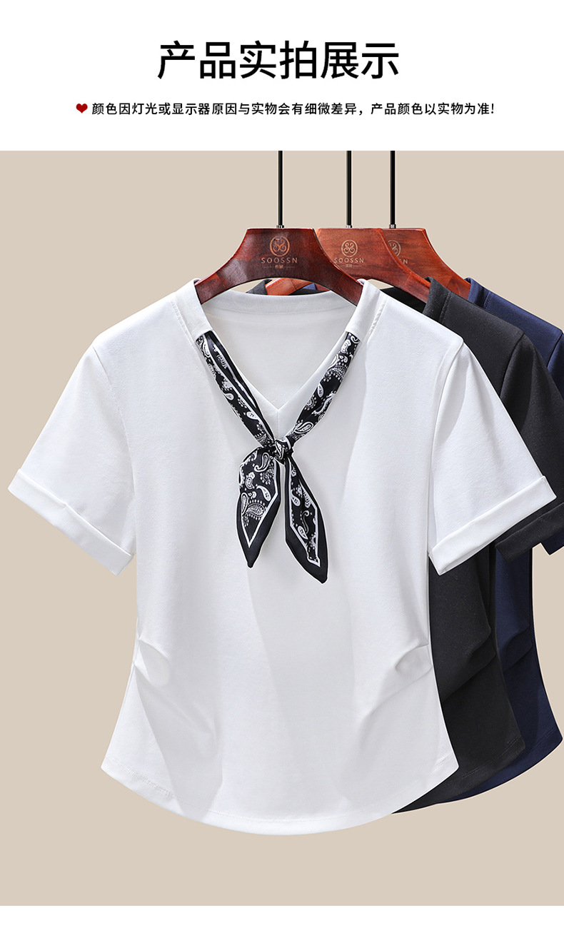 白色V领短袖女t恤2025新款爆款夏季丝巾设计感小众超好看气质上衣