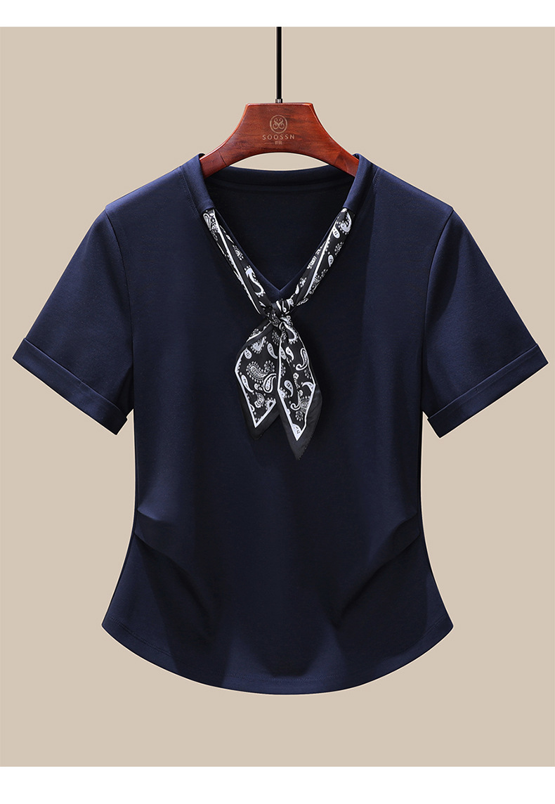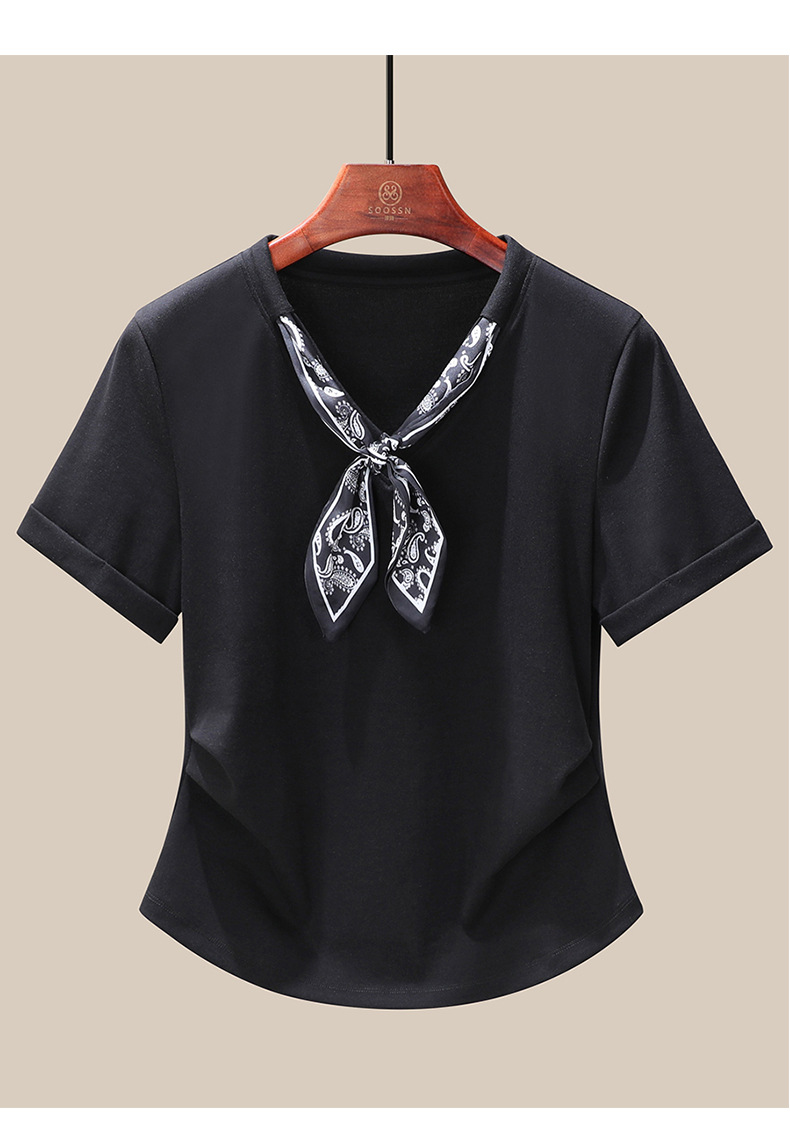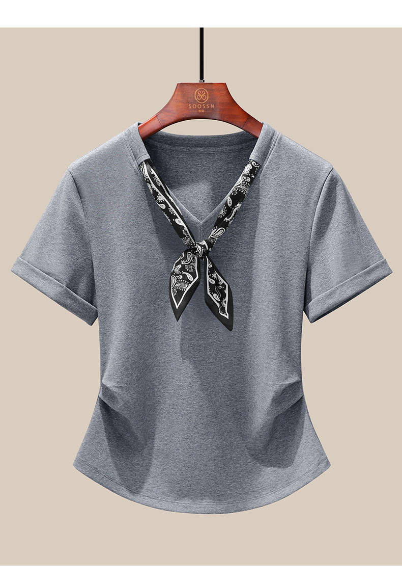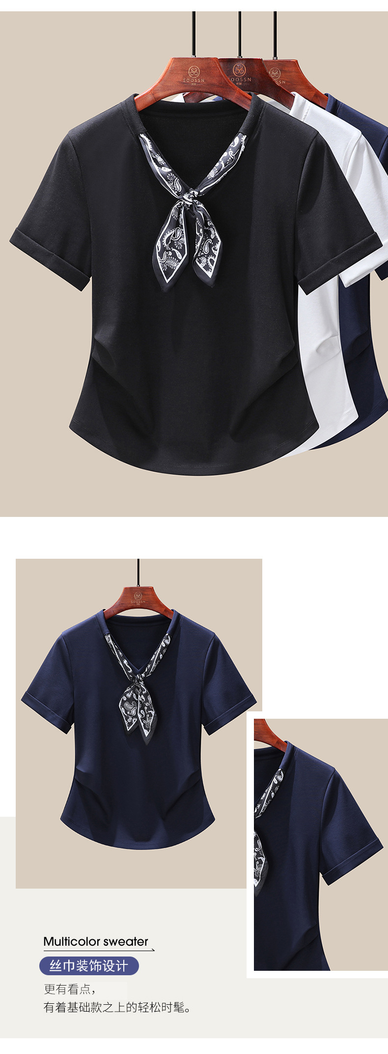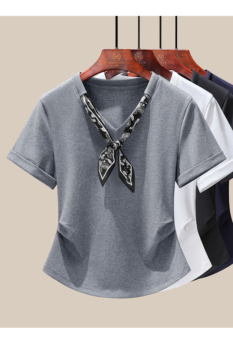 白色V领短袖女t恤2025新款爆款夏季丝巾设计感小众超好看气质上衣